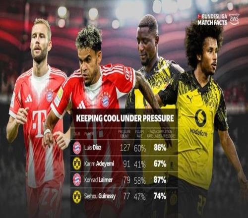而今年1月9日是,AWS又強調指出:談到壓力,這不僅關乎控球,更體現了在比賽中能否保持頭腦清醒。壓力下傳球成功率衡量球員在防守壓力下成功將球傳給隊友的概率。凱恩在承受壓力時的傳球成功率為78%,但迪亞斯以88%的數據超過了他,展現了即使在最棘手的時刻也有驚人的準確性。衡量處理壓力的關鍵指標是擺脫率,它顯示球員在對手施壓時能夠擺脫防守的概率。凱恩和迪亞斯分別承受了218次和325次壓力。