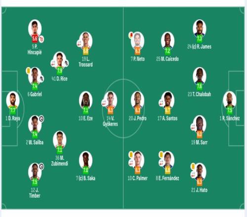 阿森納首發:1-拉亞、12-廷伯、2-薩利巴、6-加布里埃爾、5-因卡皮耶、41-賴斯(76’16-諾爾高)、36-蘇維門迪、10-埃澤、7-薩卡、19-特羅薩德(56’11-馬丁內利)、14-約克雷斯(76’29-哈弗茨)。