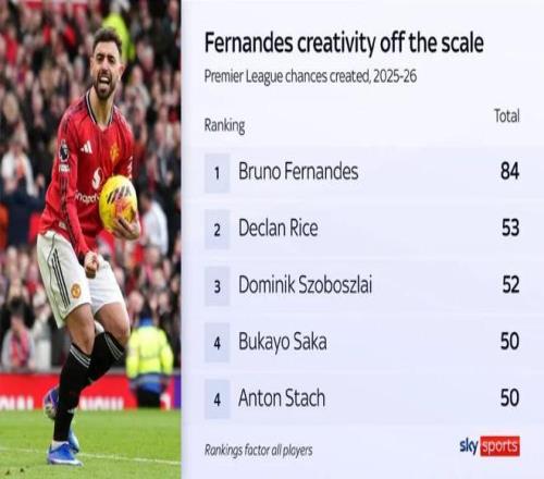 天空體育:本賽季至今,B費在英超聯(lián)賽中創(chuàng)造84次機會,是所有球員中最多的,第2名的賴斯共創(chuàng)造53次機會。
