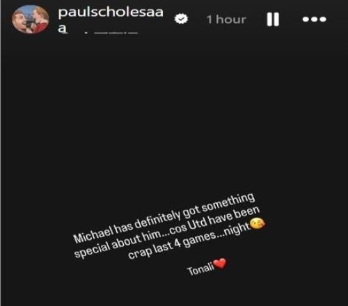 斯科爾斯寫道:“邁克爾(卡里克)身上肯定有某種特別之處。因?yàn)槁?lián)最近4場(chǎng)比賽表現(xiàn)簡(jiǎn)直爛透了,晚安,托納利!”