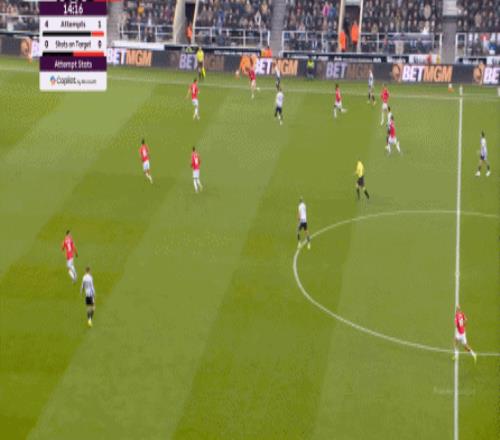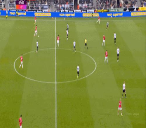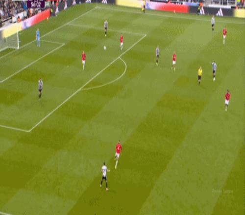 連續兩場迎來人數上的優勢,這本來是極為有利于曼聯的發揮,庫尼亞隨后在特里皮爾身上更是再次打出明顯優勢,但被紐卡堵住: