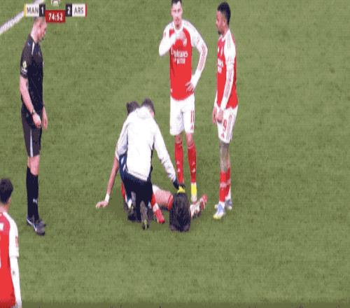 第75分鐘,卡拉菲奧里大腳解圍過后,直接坐在地上,疑似肌肉出了問題,無法堅持,被薩卡換下。