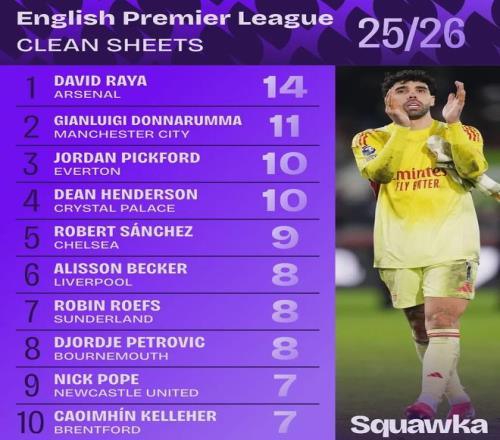 Squawka統(tǒng)計(jì),拉亞本賽季已經(jīng)在英超完成了14場(chǎng)零封,零封場(chǎng)次已經(jīng)超過(guò)了上賽季(聯(lián)賽)。