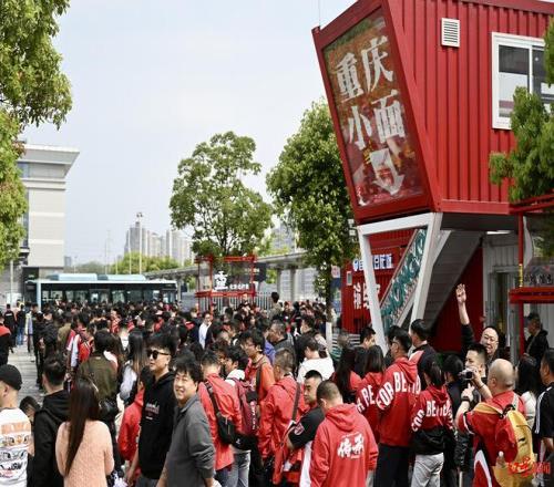 成都球迷在重慶北站統(tǒng)一乘坐大巴車前往重慶龍興足球場(chǎng)