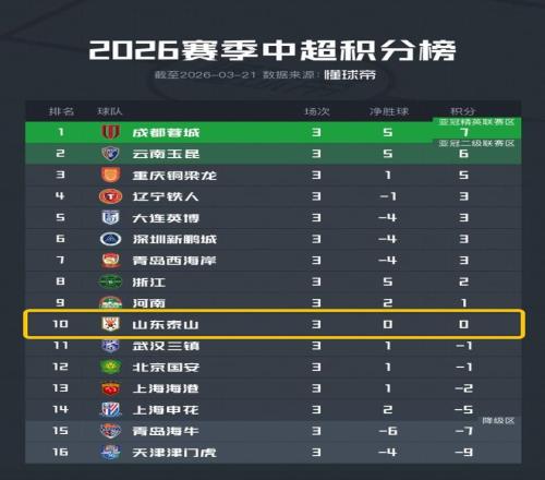 中超第3輪,山東泰山客場0-4完敗云南玉昆,3輪過后積0分,凈勝球歸0。泰山隊賽季初被扣6分,球隊首輪3-0完勝遼寧鐵...