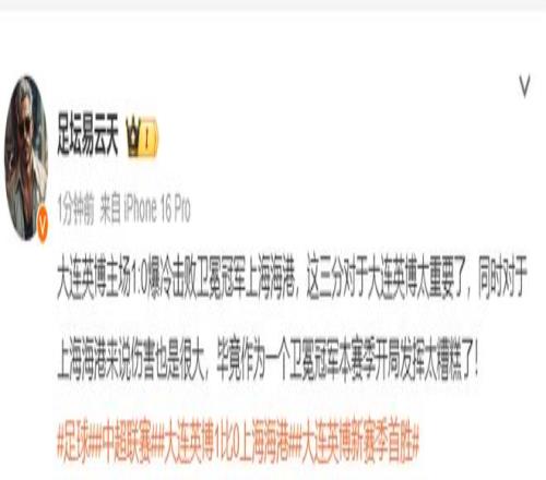 知名博主“足壇易云天”發文表示,大連英博主場1:0爆冷擊敗衛冕冠軍上海海港,這三分對于大連英博太重要了,同時對于上海海港來說傷害也是很大,畢竟作為一個衛冕冠軍本賽季開局發揮太糟糕了!