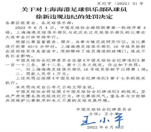 此外,三鎮(zhèn)外援馬爾康和前海港國腳徐新,都分別因為踢壞球員通道的玻璃門和賽事入場拱門被禁賽1場,罰款人民幣1萬元。