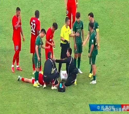 另一段爭議出現在下半場一次頭部受傷。浙江球員一腳抽射,皮球直接悶在重慶隊球員頭上,人當場倒在地上,半天沒起來。張曉晨沒有立刻吹停比賽,場邊的隊醫一看情況不對,直接沖進場內。當時,球還在浙江隊腳下,比賽并沒有停止。按規則,隊醫未經允許入場,應該被裁判驅逐出場,但倒地的球員一動不動,也不能完全怪隊醫。