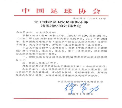 據足協通報披露,北京國安此次受罰,系因2017年及2021年兩度存在違背體育道德、背離職業精神、謀求不當利益之行為,最終被處以扣除5個聯賽積分、罰款40萬元的處罰。