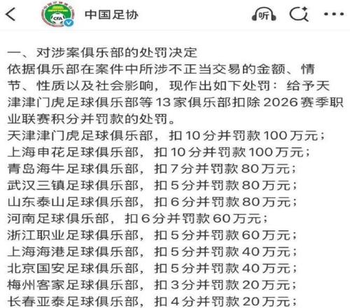 上海申花與天津津門虎雙雙領到頂格罰單:新賽季初始積分為-10分,并各被處以100萬元罰款。