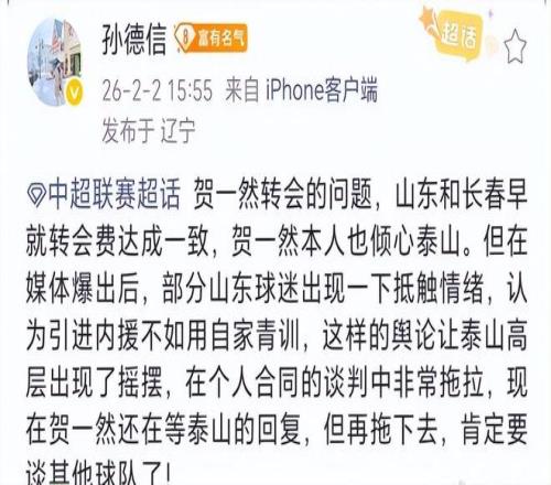 不過,計劃趕不上變化。就在大家以為這樁轉會交易板上釘釘的時候,近期有博主卻爆料賀一然的轉會陷入了停滯。原來,不少山東泰山球迷認為,與其引進賀一然,不如重點培養自家的青訓球員,只要給予充足出場機會,史松宸的實力未必不及賀一然。受這種外部輿論影響,泰山俱樂部在引援決策上開始陷入搖擺狀態:一方面,后防線的困境迫切需要引援補強,賀一然的能力與潛力符合球隊需求;另一方面,外部球迷情緒、過往多筆引援失敗帶來的輿論壓力,讓俱樂部高層顧慮重重、猶豫不決。