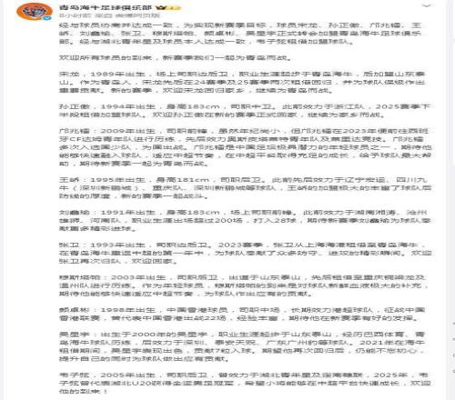 青島海牛大年初一官宣十將!北京時間2月17日上午,青島海牛俱樂部官宣,宋龍、孫正傲、鄺兆鐳、王嶠、劉鑫瑜、張衛、穆斯塔帕、顏卓彬、吳星宇轉會加盟俱樂部,韋子弦租借加盟。