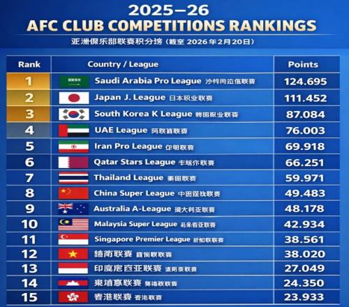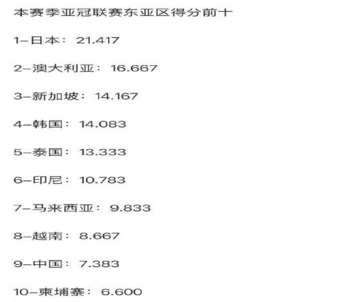 在2025-26賽季,中超球隊僅獲得7.383分的亞冠技術積分,在東亞區排名第9位,低于泰國(13.333分)、印尼(10.783)、馬來西亞(9.833)、越南(8.667)、新加坡(14.167),更是遠遠低于日本(21.417)、韓國(14.083)。7.383分,讓中超排名亞足聯第15位,在東亞區則排名第9位,僅比排名第10位的柬埔寨(6.600)多出不到1分。