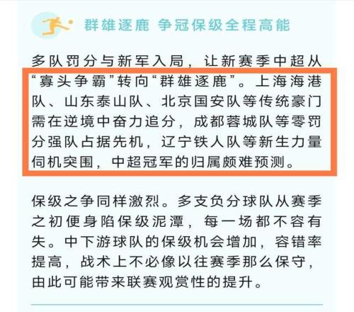 第二個(gè),這篇文章還提到了一個(gè)細(xì)節(jié),那就是介紹今年中超的爭(zhēng)冠格局是群雄逐鹿,專門提到了5支球隊(duì)名字,分別是海港、泰山、國(guó)安、成都蓉城和遼寧鐵人,再次認(rèn)可了遼寧鐵人的爭(zhēng)冠可能性。