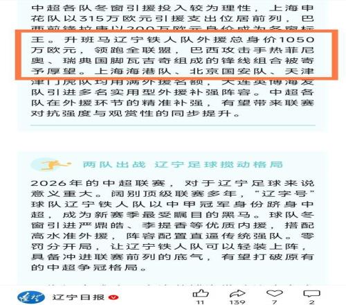 《遼寧日?qǐng)?bào)》官方發(fā)聲的這篇報(bào)道,專門展望了遼寧鐵人和大連英博新賽季的前景和目標(biāo),不知道遼寧球迷對(duì)此認(rèn)不認(rèn)可了?(老邱)